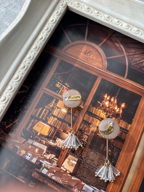 フランス素材とガラスボタンで制作した2wayピアス。このキャットモチーフの見覚えはありませんか?