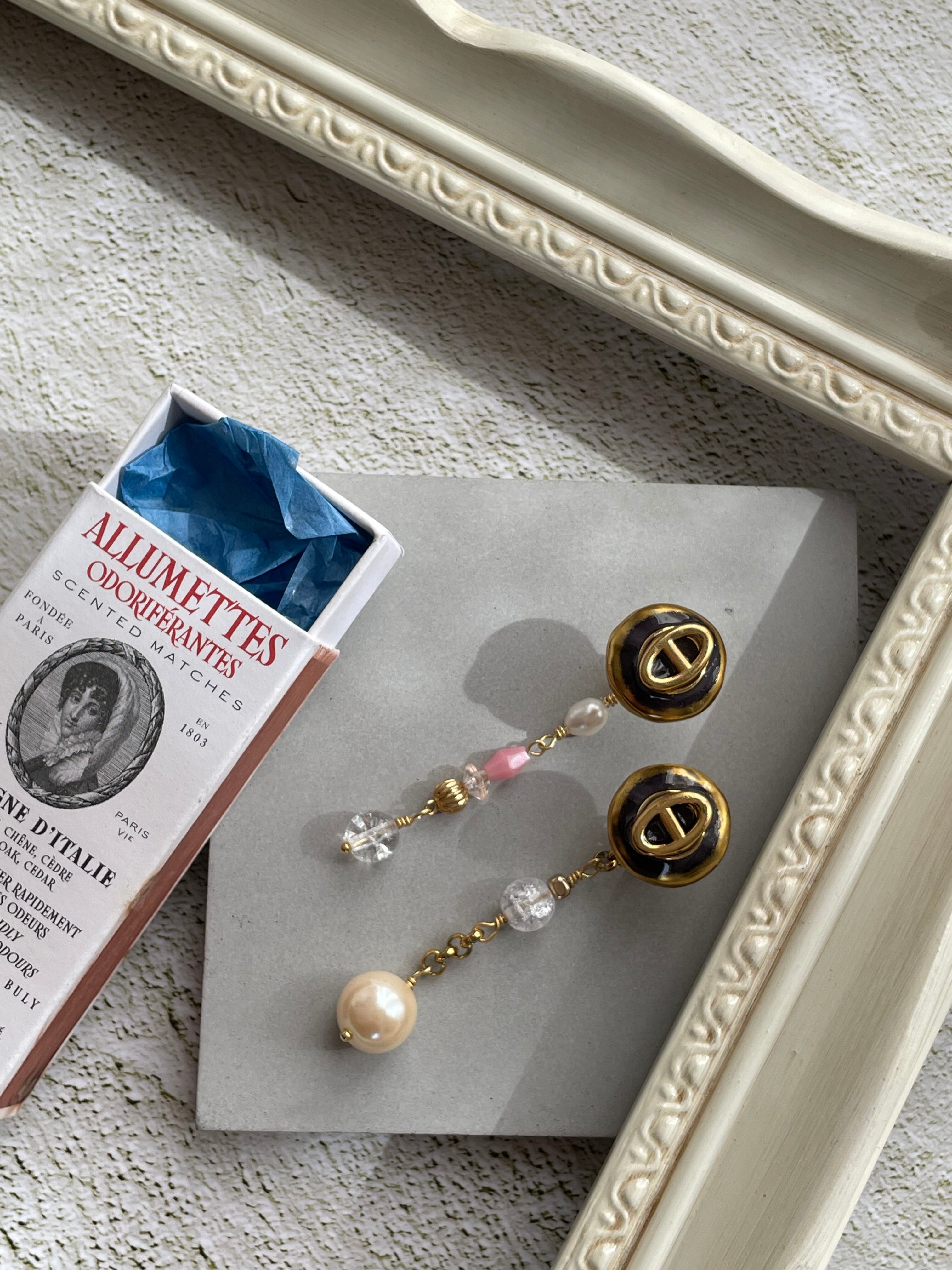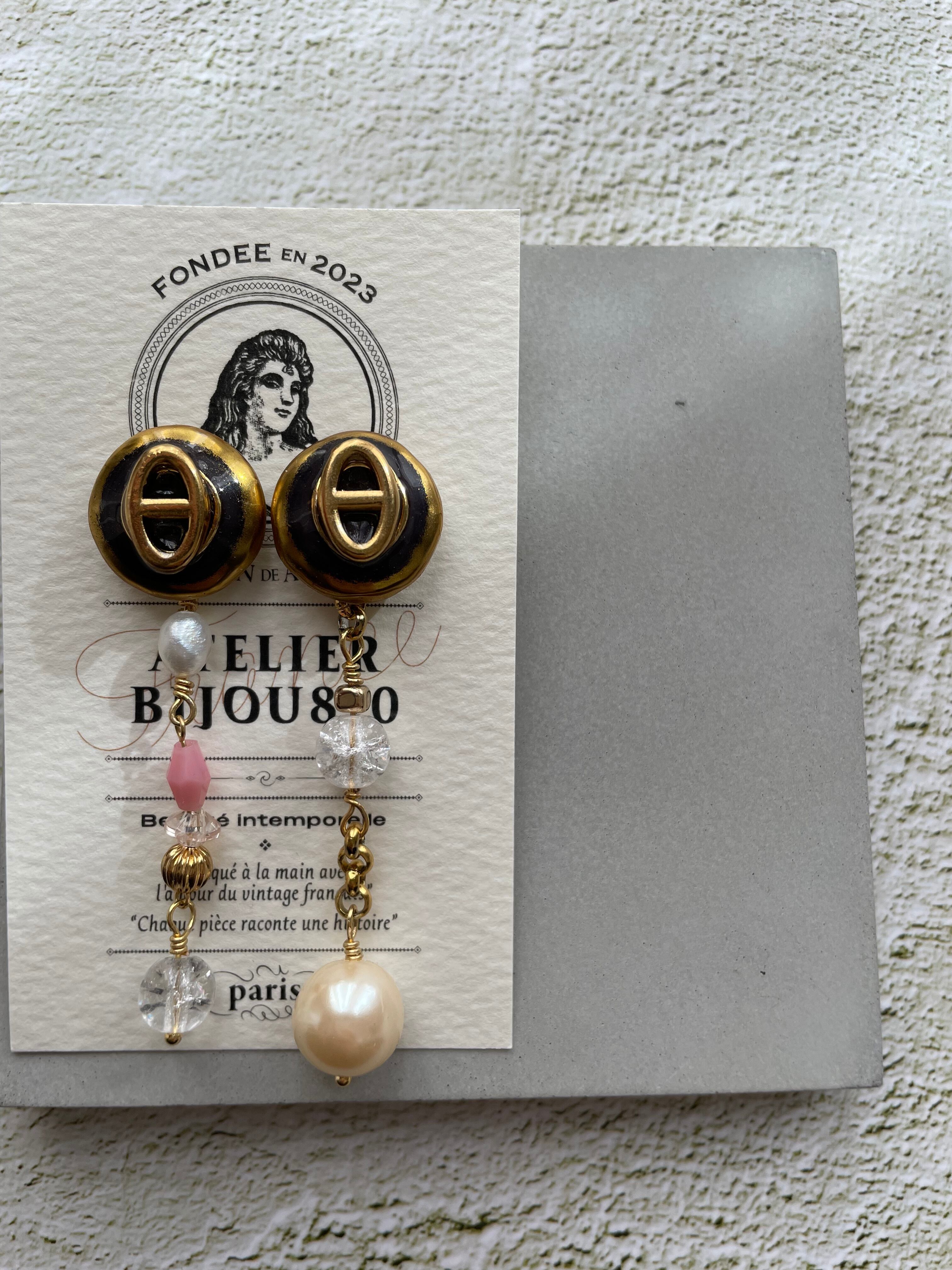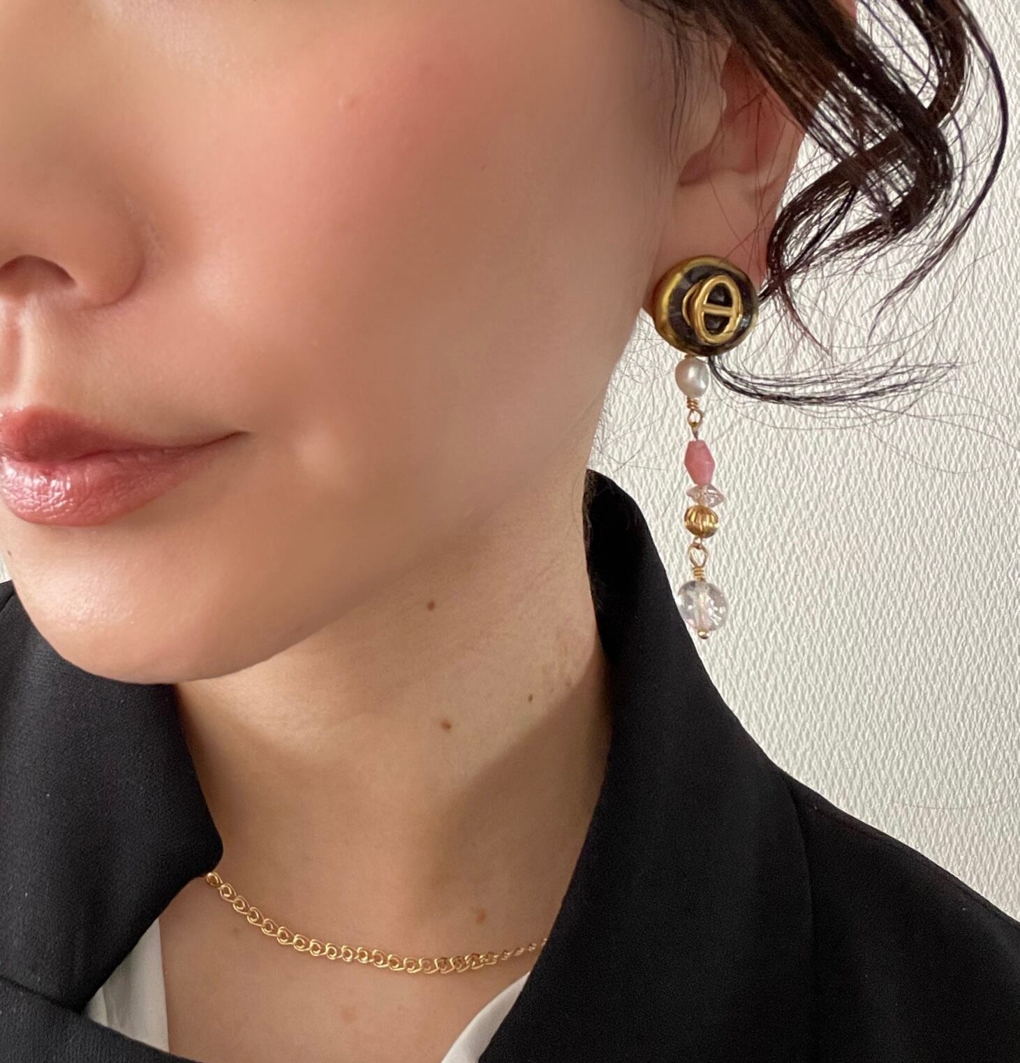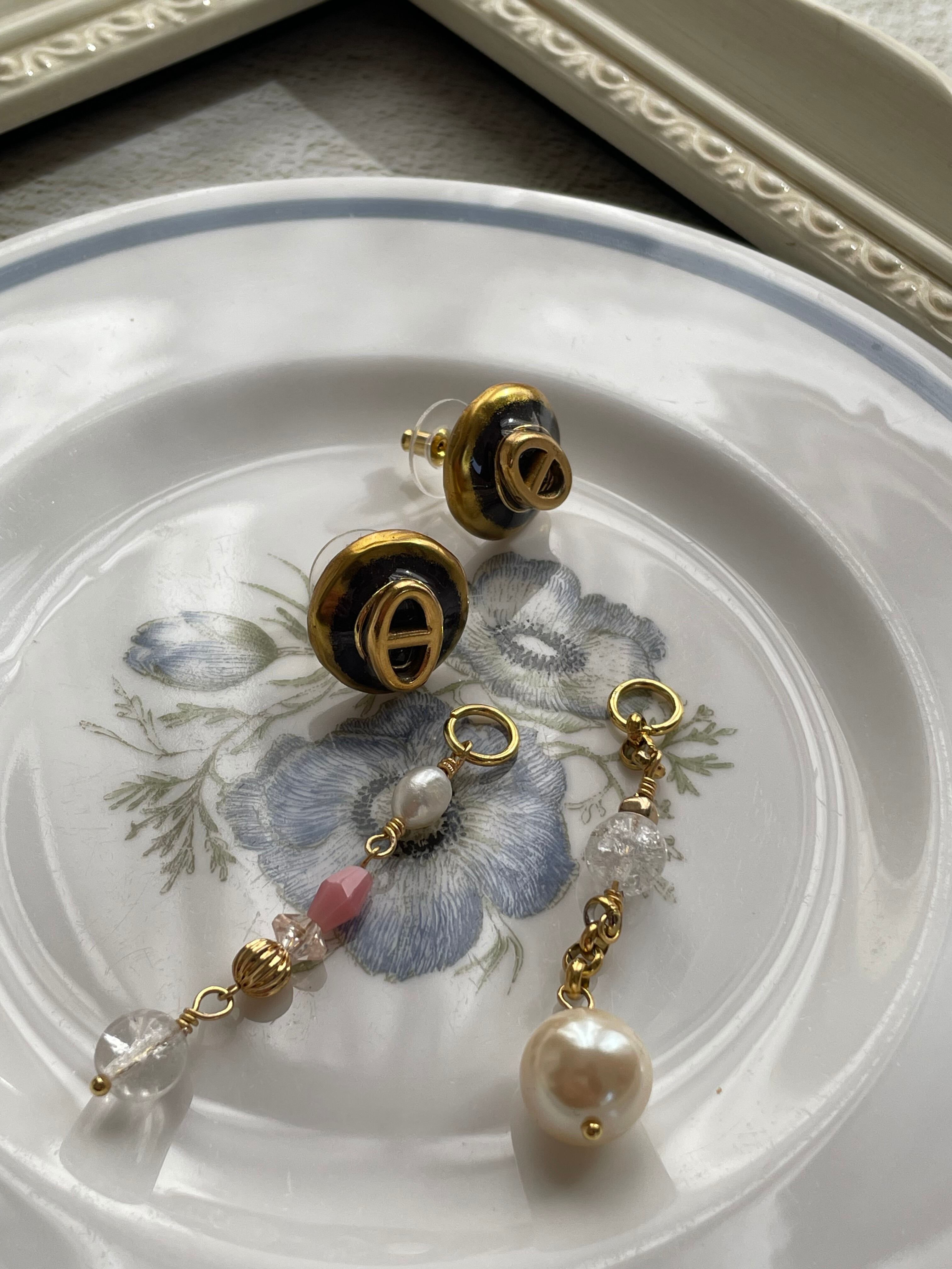 このピアスは、左右異なるパーツを使用しておりゴールドカラーで縁取りをしてます。